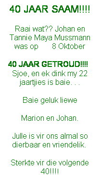 Sjoe, ja nee, dit was ‘n naelbyt stryd.  Die Cheetahs en Bulle het ons laat bloed sweet!  Daar is verskillende opinies oor die deel van die beker maar sal ek wat niks van rugby weet maar vir julle sê albei spanne het darem vrek goed gespeel!!  Neels se stem is na 4 dae nogsteeds soek. . .  dit  sê natuurlik alles.  Ons het bietjie daaroor gefilosofeer ook. Eintlik is die Cheetahs beter af as die Bulle want ons het reeds die beker gehad, dus het ons niks verloor nie. . .ek weet nie dis Neels se storie daai. . . Julle moet hom maar daaroor aanvat. . .  Groete Hanlie